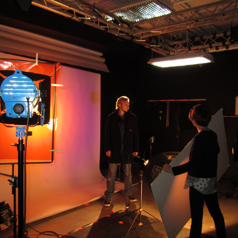La Key Light (qui sert de rim light également dans ce cas-ci) est placée derrière le sujet et sa lumière étant réfléchie sur un gros carton blanc, sert de fill light pour remplir les ombres du visage. Nous avons ajouté deux fill Lights pointant vers le centre du fond blanc ayant des gels de couleurs orange et bleu. Cet éclairage crée une intensité d’émotion au personnage, allume l’oeil de celui-ci et montre exactement où le sujet regarde.