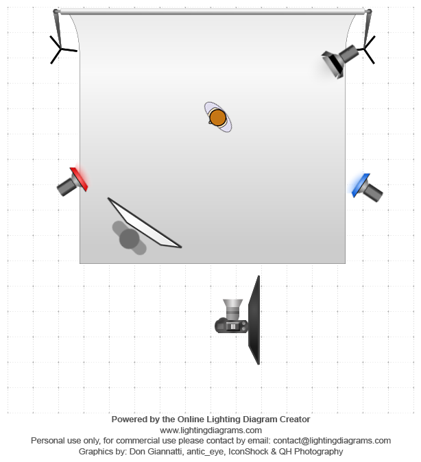 Le set up de cette photo était un essai d’une exploration des gels de couleur qui nous intéressait avant la scéance photo. Nous avions une très petite idée de comment la photo originale était, mais nous avons essayé plusieurs combinaisons d’emplacement de lumière. Tiffany se déplaçait avec le réflecteur pour tenter de trouver le bon angle pour refléter la lumière de la Key Light et ainsi ajouter de la lumière dans les zones ombragées.